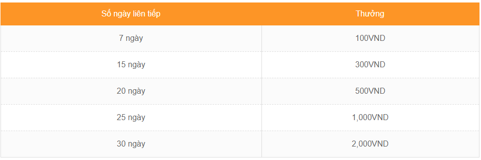 Mức tiền thưởng sẽ có cá mênh giá 100k,300k,500k,1000k,2000k tiền cược miễn phí tùy vào anh em đăng nhập thế nào được miêu tả trong bảng thưởng dưới đây